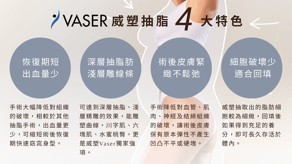 威塑抽脂專注於脂肪的抽吸,手術過程中對周圍組織的破壞大幅降低,相較於傳統抽脂方法,出血量少,術後恢復期更短,讓您能快速擁有窈窕身型。